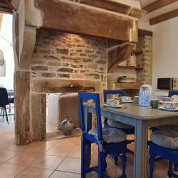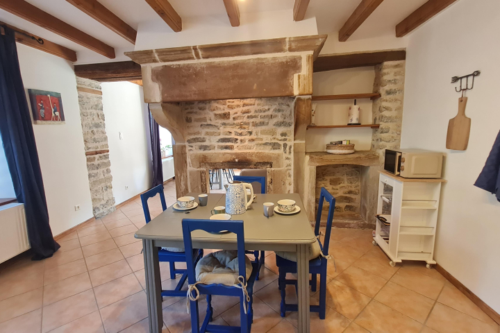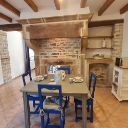 Once you have passed the door, you will be immersed in a chic and warm atmosphere, with the discovery of a beautiful sandstone fireplace in the kitchen in blue and white tones. You will find everything you need to make good dishes and breakfasts with family or friends.